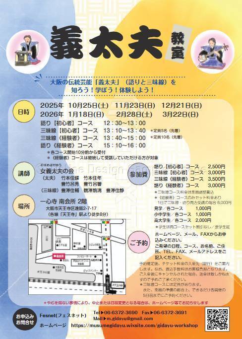 料金 | 参加費 語り【初心者】コース 2,500円三味線【初心者】コース 3,000円三味線《経験者》コース 3,500円語り《経験者》コース 3,000円※三味線コース料金は楽器調整費500円込み ※《経験者》コースのみ1日で三味線・語り両方受講の場合 6,000円 見学/各コース 1,000円 小中学生/各コース 1,000円 高大学生/各コース 2,000円 ※学生は両コースセット割引なし/要学生証 |