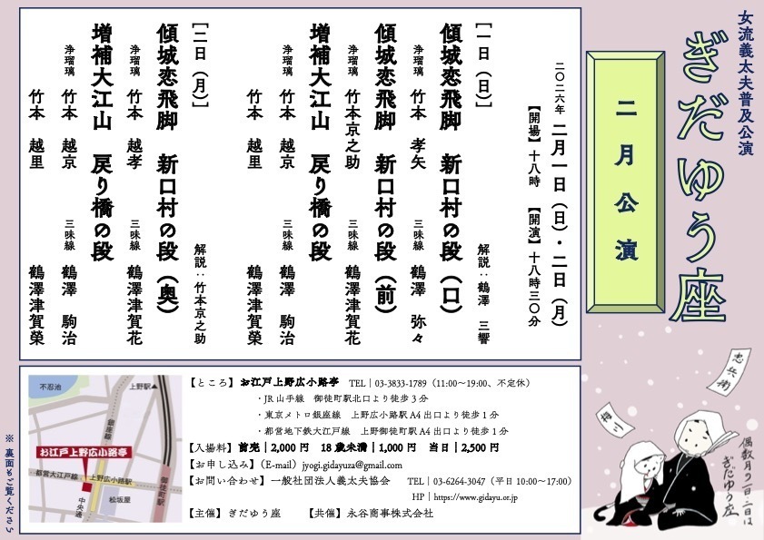 | お問い合わせ | (一社)義太夫協会 tel: 03-6264-3047 (平日10〜17時) email: [email protected] |